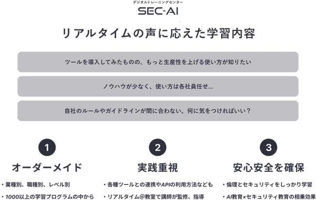 当社は、このAI活用の人材育成ニーズに迅速に対応するため、当教室の設立を決定しました。これは、近年お客様から多く寄せられる要望に応えるもので、1.オーダーメイドのプログラム、2.実践重視の内容、そして3.安心・安全な学習環境の確保、この3つのポイントを重視した学習内容を提供します。