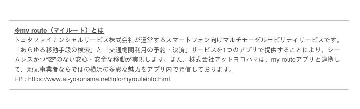 この取り組みは、「my routeアプリ」ならびにポータルサイト「@YOKOHAMA(アットヨコハマ)」で横浜の魅力を配信する弊社と、みなとみらいの街づくり推進及び地域の活性化を図るみなとみらい21SP推進委員会の想いが一致し実現に至りました。概要は下記をご参照ください。