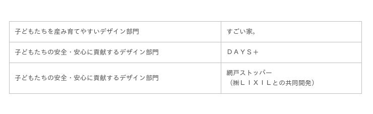株式会社LIXIL住宅研究所は、経済産業省などにより創設された特定非営利活動法人キッズデザイン協議会(本部:東京都港区)主催の「第15回キッズデザイン賞」の「子どもたちを産み育てやすいデザイン部門」において『すごい家。』、「子どもたちの安全・安心に貢献するデザイン部門」において『DAYS+』と『網戸ストッパー((株)LIXILとの共同開発)』の計3作品が、子どもや子育てに関わる人々に寄与する製品、建築・空間などとして評価され、キッズデザイン賞を受賞しました。