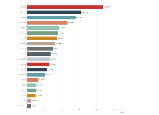 1位は「卵焼き(14.5%)」2位は「ウィンナー(10.3%)3位は「唐揚げ(9.3%)」という結果になりました。ヴィーガン的ライフスタイルに関心のある読者さんだけに意外でしたが、全問の答えにあるように、ご家族に作られている方も多いため、その方の好物を作る、ということかもしれません。