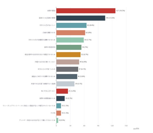 第1位は「食費の節約」16.5%、そして「家族のため/家族の要望」「手作りの方が美味しい」と続きます。「ヴィーガン/プラントベースに対応した製品が近くで販売されていないため(1.3%)」や「アレルギー対応のお弁当が近くで購入できないため(0.5%)」などの食事制限のためにお弁当を作る方は少数にとどまりました。