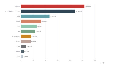 およそ3割の方がInstagramを参考にされています。2位に「レシピ投稿型サイト・アプリ」が続き、3位には「料理本」,6位には「雑誌」と紙媒体も健在なようです。