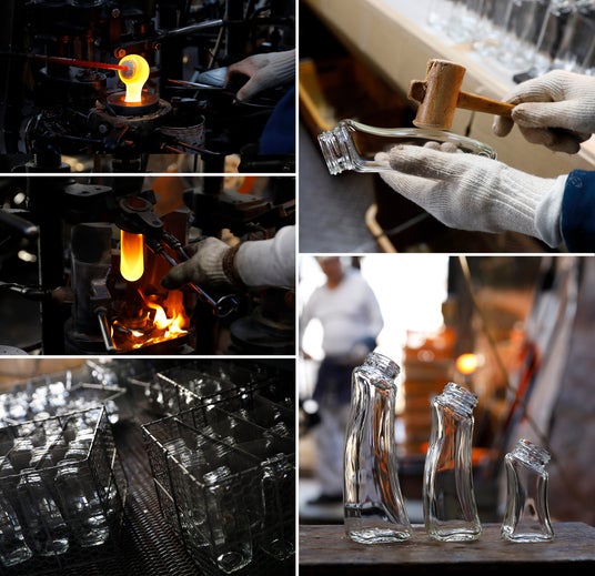 1個のガラス瓶を作るためには3人の職人の連携した作業により完成されます。3人の呼吸が合わない時はまったく製造できず、1日に最低0本の時もあれば最高で450本の時もあります。