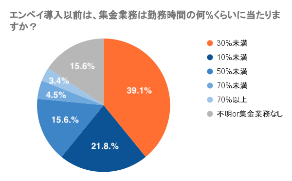 エンペイ導入前までの通常業務における集金業務の割合について、最も多かったのが全業務時間の30%未満という回答。他にも、業務時間の半分以上を使っている方もいることが判明し、総じて、6割以上の方が「集金業務が全体業務の10%以上を占めている」結果になりました。