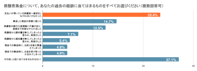 エンペイをご利用中の保育者136名に、エンペイ導入前の集金業務に関する経験談を聞いたところ(※1)、「その他」を除いて、「支払いが滞っている保護者へ催促をしなければいけなかった」が最も多いことがわかりました。その数は、およそ4人に1人にのぼります。