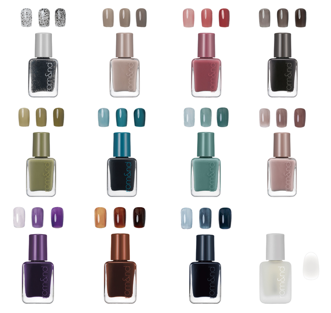 左上から、00 crunky black、01 NU-PEBBLE、02 ROZY-SYRUP、03 MONGDOL、04 MUD GREEN、05 DEEP AQUA、06 OK、07 MAUVE SAND、08 PURPLE MOOD、09 AMBER、10 DUSK NAVY、11 CLOUD MATTE