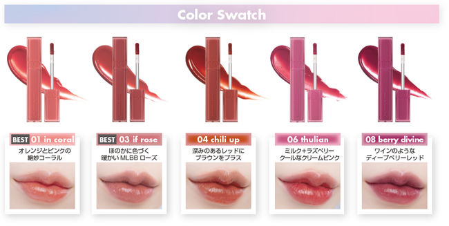 塗り重ねても重くなりにくいテクスチャーで、時間が経っても透明感のあるカラーをキープします。カラー展開は、デイリー使いしやすい全5色。パーソナルカラー問わず使いやすいカラーが揃っていますが、01・03・04はイエベ向け、05・08はブルベ向けのトーンとなっています。スケルトンでスクエア型のパッケージもポイント!