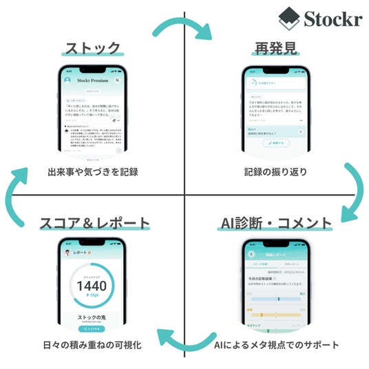 日々の思考や感情を記録する「ストック機能」、過去の記録から気づきを得る「再発見機能」、そしてAIがサポートする「ビジョン設定コーチング」「AIコメント」「価値観診断」、日々の積み重ねを可視化する「スコア&レポート機能」を提供し、自己理解と自信の積み上げを支援します。