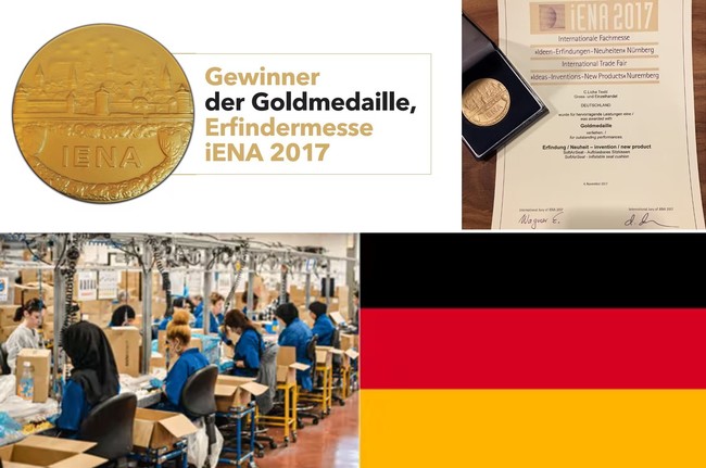 iENA International Trade Fair 2017(発明フェア)で金メダル獲得したデザインはドイツ特許取得済です。国際基準のISO9001認定された工場で汚染物質を発生させずに生産されています。