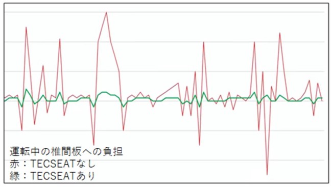 車の運転中にかかる脊髄への負担を計測したところ、SoftairSeatHybridがクッションとなり体圧分散し最大90%負担を軽減することがわかりました。