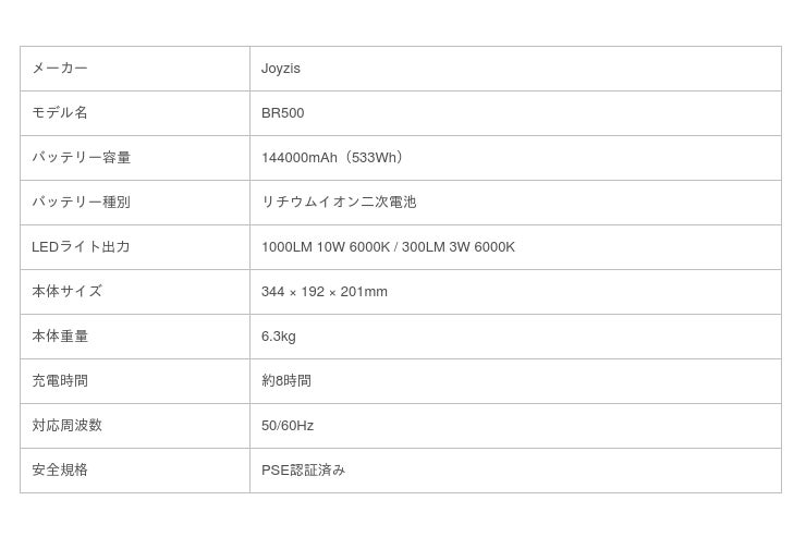 ▼Joyzis ポータブル電源 大容量 BR500 の仕様