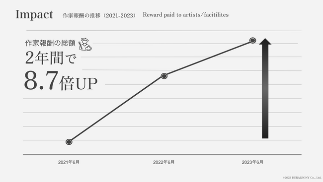 へラルボニーは会社と契約作家の双方にとって持続可能な事業を推進するため、得られた収益からライセンス使用料を支払うビジネススキームを構築しています。事業成長に伴い、ライセンス使用料の年間支払額(作家報酬)は過去2年間で8.7倍にも増加しました。一般企業への就職が困難とされる重度の障害のある人が多く利用する就労支援B型の福祉施設の平均工賃が月額15,776円*とされるなか、年収が数百万を超え確定申告を行うアーティストが複数名生まれています。