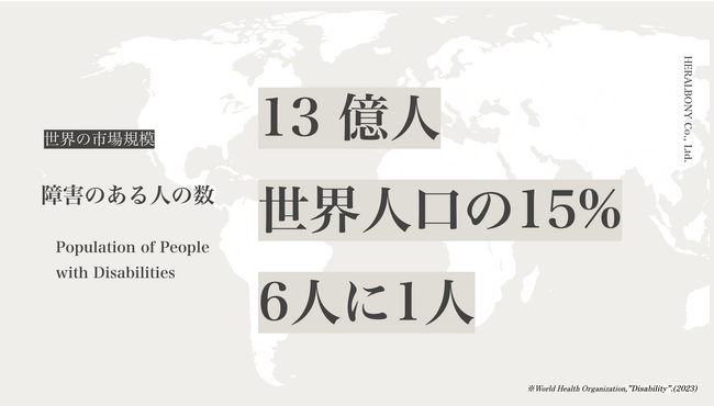 世界で障害のある人の数は13億人**。およそ6人に1人が何かしらの障害を有する当事者 です。 ヘラルボニーは、新たな未来へのチャレンジとして「アート」という世界での共通言語を入り口に、2024年以降に海外展開を予定しています。