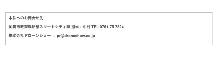 株式会社ドローンショーと加賀市はドローンを用いた新産業の創出や地方創生を実現するため、両者協働のもと、様々な取組を実施することを目的に包括連携協定を締結します。