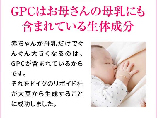 「GPC」はお母さんの母乳にも含まれている生体成分です。赤ちゃんが母乳だけでぐんぐん育つのは「GPC」のおかげです。