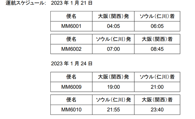 なお、大阪(関西)-ソウル(仁川)線は需要回復を鑑み、2023年1月21日、24日、それぞれ1往復の合計4便を増便いたします。