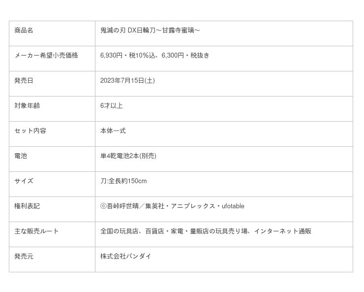 本商品はテレビアニメ『鬼滅の刃』に登場するキャラクター「恋柱・甘露寺蜜璃」のアイテムである“日輪刀”をイメージした音声搭載なりきり玩具です。恋の呼吸の型や、劇中の台詞・効果音を合計30種以上収録しています。柄のボタンを押すと日輪刀の鍔がピンク色に発光、セリフが流れます。セリフが流れた後に日輪刀を振ることで効果音が発動、甘露寺蜜璃になりきって遊べます。本体は全長約150cm で、刀身部分をリボンにすることで極めて薄く柔らかい作品内での日輪刀を再現しています。
