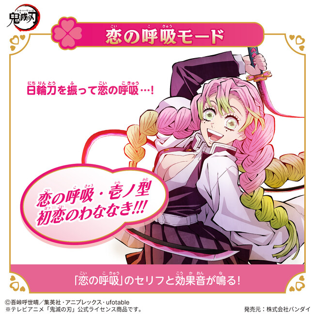 劇中で、鬼との戦いの際に甘露寺蜜璃が使用する「恋の呼吸」のセリフと効果音が楽しめます。