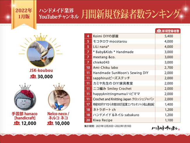 ハンドメイド作家の活動を支援する情報メディア「ハンドメイドチャンネル」を運営する一般社団法人和文化推進協会(所在地:京都府京都市、代表理事:横山雅美)は、2022年1月に活躍したハンドメイド業界YouTubeチャンネルのランキングを発表しました。