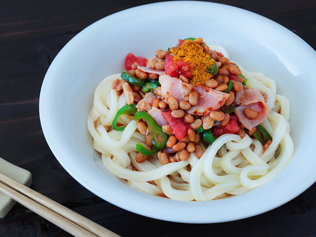 【夏野菜とベーコンのスパイシーカレー納豆うどん】