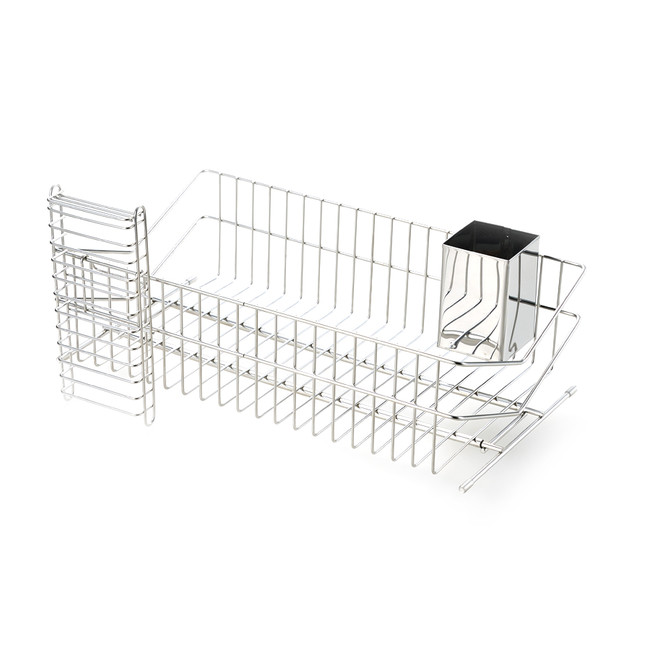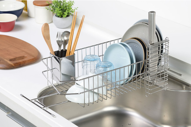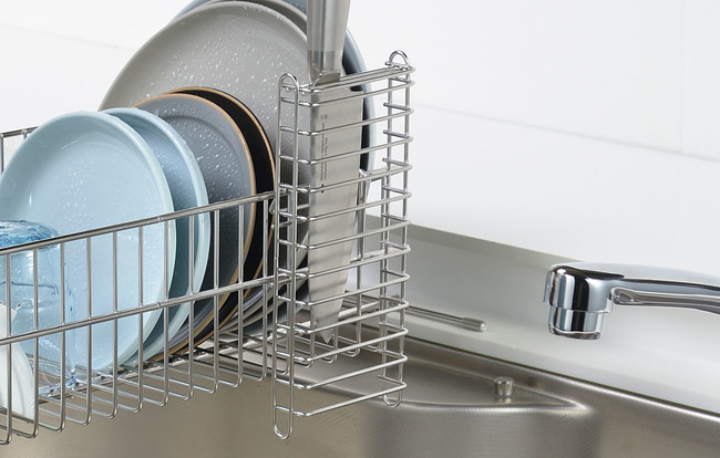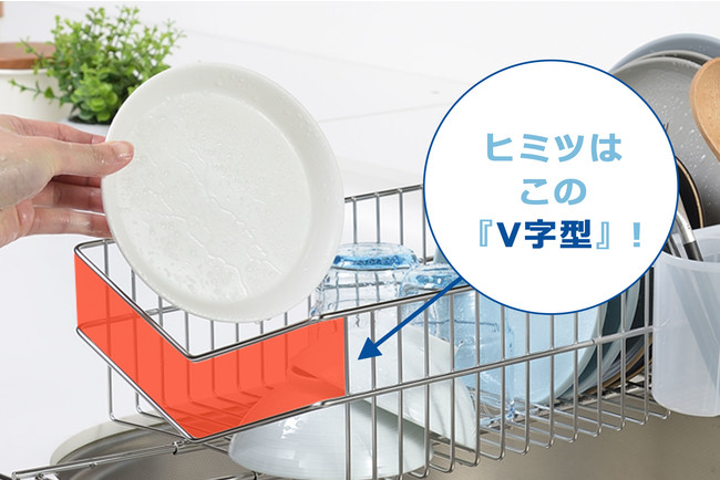 調理スペースを有効活用するためシンク上を渡せる水切りラックです。水が直接シンクに落ちる構造で、無駄を省いたシンプルなデザインがシンクに馴染んでオシャレな空間にします。「V字型バスケット」は特徴的な形ですが、機能を追求した結果このフォルムに辿り着きました。