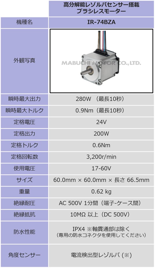 マブチモーター株式会社(本社:千葉県松戸市、代表取締役社長: 高橋徹)は、AGV※1 ・ AMR※2 をはじめとする様々な移動体用途で活用いただけるブラシレスモーター「IR-74BZA」を開発し、販売を開始いたしました。