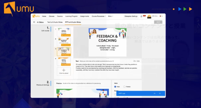 お話の中では、パワーポイント原稿をワンクリックで動画に変換できる、UMUのAI動画制作における新バージョンについても発表させていただきました。
