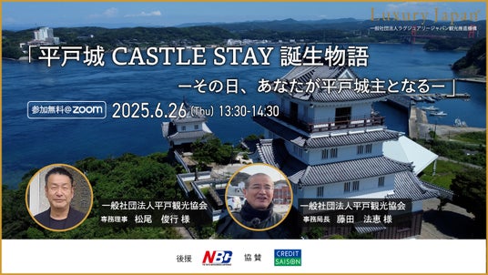 一般社団法人ラグジュアリージャパン観光推進機構(代表理事:宮山直之)は、長崎県平戸市の歴史的建築物「平戸城」を活用した宿泊施設「平戸城 CASTLE STAY」について、その誕生までの軌跡や地域観光戦略を紐解く無料ウェビナーを開催いたします。