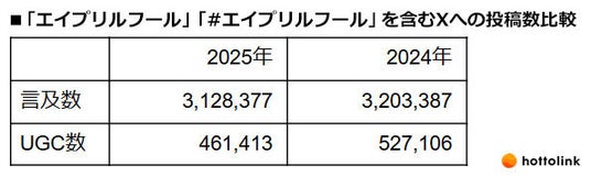 2025年と2024年の4月1日における「エイプリルフール」「#エイプリルフール」を含む言及数・UGC数を抽出しました。
