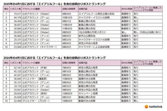 2025年と2024年の4月1日における「エイプリルフール」 を含む投稿で、リポスト数のランキングを作成しました。TOP10は以下の通りです。