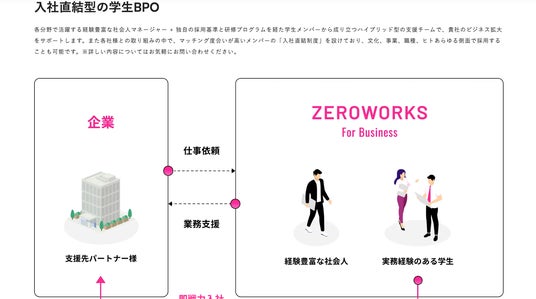 - “ゼロキャリア”という育成インフラ-学生が実務で鍛えられる場を企業活動と接続し、「学び」と「即戦力」を同時に生み出す仕組みを提供。