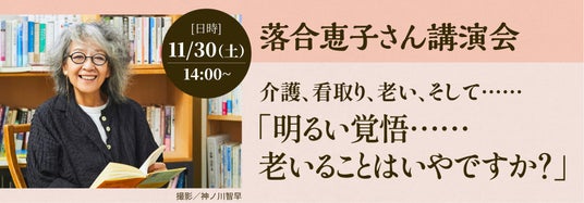- 講演内容:「老い」をテーマに、母の介護と看取り、友人の死、毎年1月1日に書くリビングウィル、そして自身の老いなどについてお話しいただきます。当日は会場から落合さんへの質問を受け付け、講演会後はサイン会も予定しています。