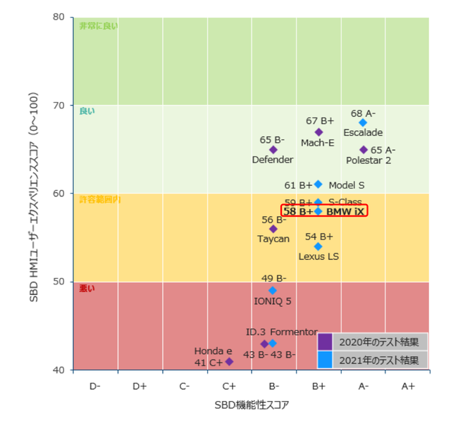 BMW iXのインフォテイメントシステムは概ね素晴らしく、シンプルで使いやすいことから、BMWが「テクノロジーフラグシップ」と称するのにふさわしいと言える。SBDがテストした対象が発売前の初回量産車であったことから、信頼性に関する問題の発生頻度が高く、予想より低いスコアとなった一因になっている可能性がある。