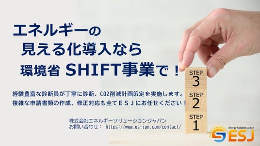 脱炭素診断により企業・事業所の脱炭素化を支援している株式会社エネルギーソリューションジャパン(略称ESJ、東京都中央区、代表取締役:田崎剛史)は、令和5年度に引き続き、令和6年度の環境省SHIFT事業「工場‧事業場における先導的な脱炭素化取組推進事業」のうちCO2削減計画策定支援事業における支援機関として採択されました。