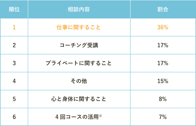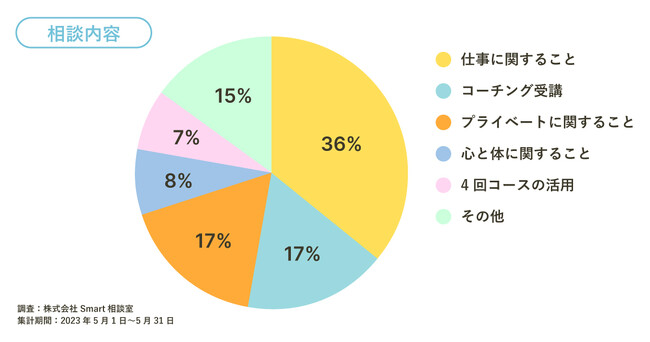 2023年5月の相談内容は、1位「仕事に関すること」36%、2位「コーチング受講」17%、3位「プライベートに関すること」17%