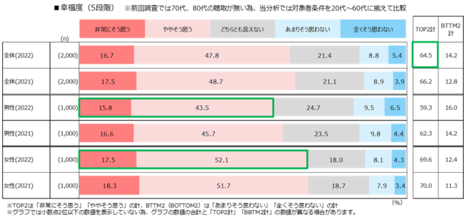 幸福度は前回調査から1.7pt低下し64.5%。男女別では、女性(69.6%)が男性(59.3%)を10.3pt上回っており、女性の幸福度が高く、また前回調査よりも男女差が広がる結果に。