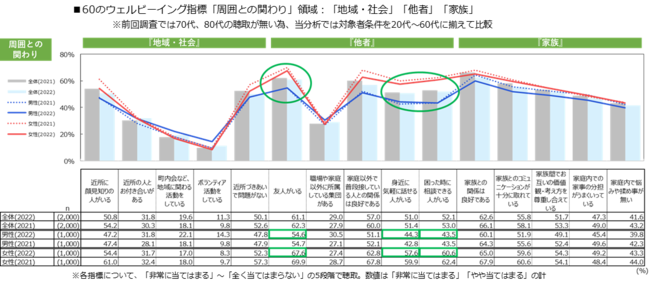 60のウェルビーイング指標の『周囲との関わり』領域において男女差を見たところ、「困った時に相談できる人がいる」が17.1pt差、次いで「身近に気軽に話せる人がいる」13.3pt差、「友人がいる」13.0pt差と、いずれも女性より男性が低い充足度となりました。女性に比べ、男性は周囲に心を許せる人が少ないことがうかがえます。