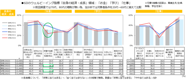 『自身の経済・成長』領域内では「貯蓄や投資についての知識がある」で男性が38.3%に対し女性が23.5%と、14.8ptもの差が見られました。女性については、『お金』5指標の中でも最も低くなっており、貯蓄・投資面において特に未充足であることがわかりました。