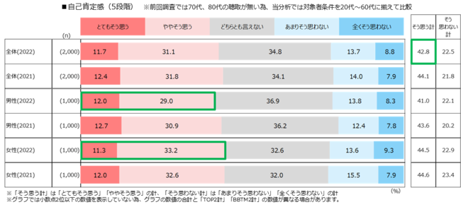 自己肯定感(自分に価値があると思うか)については、「とてもそう思う」「ややそう思う」と回答した割合は計42.8%となり、幸福度と同様、前回調査(44.1%)よりやや低下。男女別では、男性41.0%に対し女性は44.5%で、自己肯定感も女性が上回る結果に。