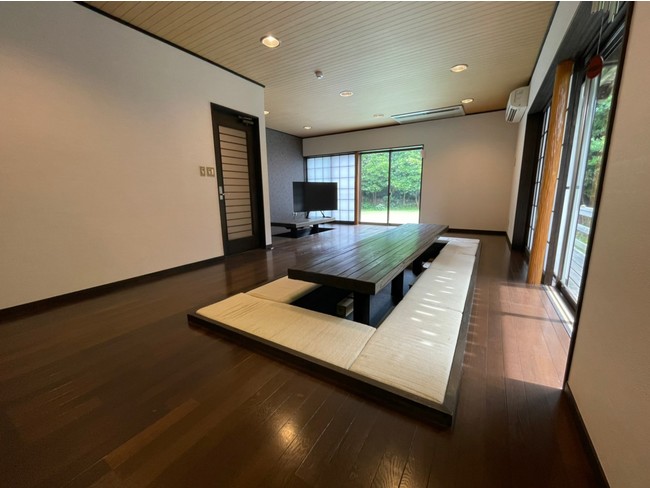 内装は大きな堀りごたつ式のテーブルがある落ち着いた古民家風空間で、広い天然芝の庭では愛犬や子供が駆け遊ぶ横で本格BBQを楽しむことも可能!