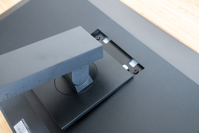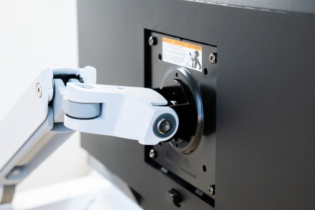 もちろん100×100mmのVESA規格に対応しているので、一般的なモニターアームが別途取り付けられます。モニターアームの使用により、さらにデスクトップスペースを節約することができます。
