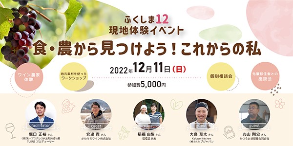 今回のイベントでは、福島県外から田村市や葛尾村、川内村に移住し、食や農業の分野で地元産業の一翼を担い仕事に励む4組の先輩移住者をゲストにお招きして、座談会やワークショップを通して現地での仕事や暮らしぶりを直に感じていただけます。
