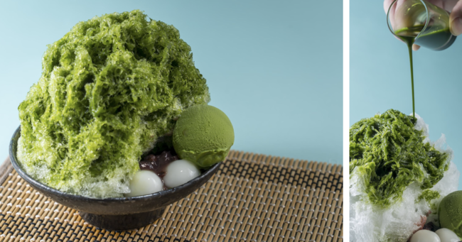 ミルクのコクと幸福感溢れる甘さが嬉しい練乳を、ほろ苦抹茶のかき氷にたっぷりかけて。