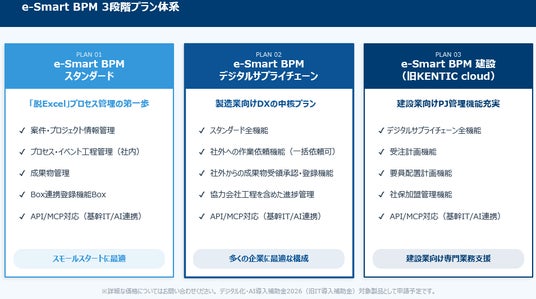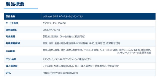 製造業・建設業向け業務コンサルティングおよびクラウドサービスを提供するPLCパートナーズ株式会社(本社:東京都品川区、代表取締役:人見正徳、以下「PLCP」)は、従来建設業向けに提供してきたプロジェクト管理クラウド「KENTIC cloud」をAI時代に対応した業務プロセスデータ利活用基盤へフルバージョンアップし、「e-Smart BPM」として2026年4月27日より提供を開始いたします。