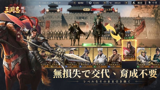 武将は損失なく交代可能、新たな武将も即座に育成完了、自由に編成を変更できます。自動徴兵システムで練兵の手間もなく、兵種も即時変更可能。あらゆる戦場に対応し、攻城戦をより爽快に楽しめます。