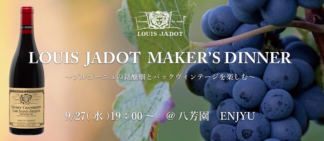 日本リカー株式会社が運営する、一般消費者向けのワイン専門オンラインショップ「Your Cellar」(ユアセラー)では、9月27日(水)に、八芳園RESTAURANT ENJYU(えんじゅ)にて、フランス ブルゴーニュのワイン生産者ルイ・ジャドを迎えて、一夜限りのスペシャルディナーを開催いたします。