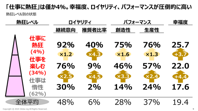 3. 仕事に熱狂(4%)、もしくは、楽しむ人(34%)は非常に貴重であり、彼らをいかに増やすかが企業価値向上の重要な切り口