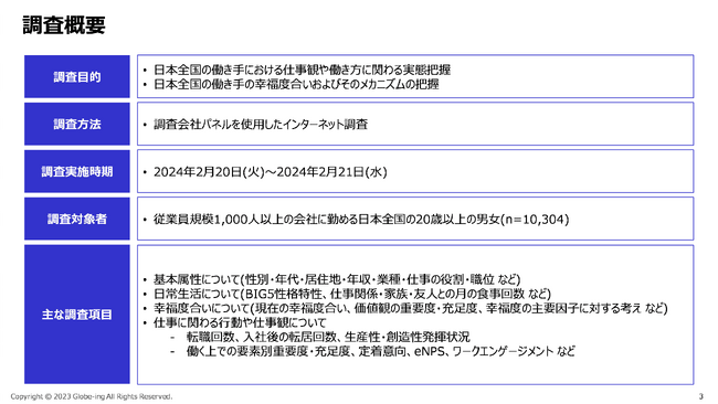 インターネット調査により、従業員規模1,000人以上の会社に勤める日本全国の20歳以上の男女に対して、1万人(n=10,304)の働き手のウェルビーイングを調査しました。