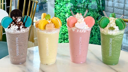 画像左から「クッキー&クリームマカチーノ」、「マンゴーヨーグルトマカチーノ」、「ストロベリーマカチーノ」、「抹茶マカチーノ」