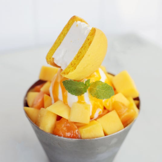 リアルマンゴー 1,480円(税込)当店自慢のふわふわ口溶けの良いかき氷に、フレッシュな生マンゴーとあんずがゴロゴロ乗ったビンス。バニラアイスクリームの上には「ピュアバニラ」マカロンが飾られ、さっぱりとしたマンゴーとの相性が抜群のデザートです。